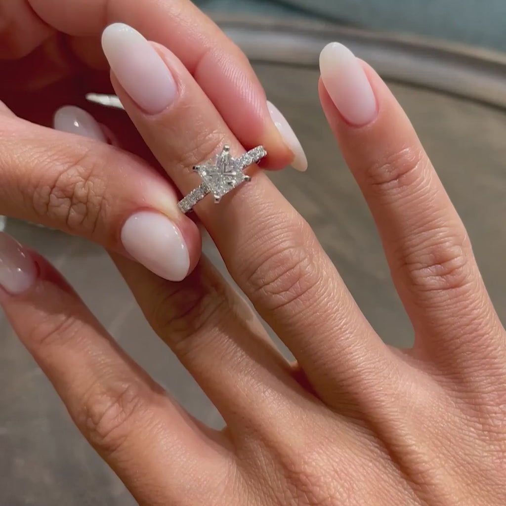 At the center of this masterpiece sits a stunning square-shaped moissanite, a gemstone renowned for its dazzling brilliance and clarity. It's a symbol of pure affection, cradled by the tender embrace of the ring's arms. Encircling this central treasure are meticulously placed round moissanite stones, their luminous dance reflecting the endless journey of your shared love.
